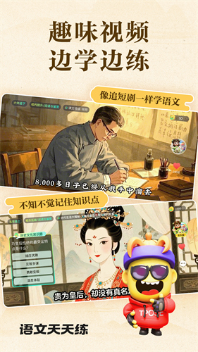 语文天天练2025年最新版是一款专为6-18岁学生设计的“AI智能辅导+趣味闯关”语文提分神器,结合了丰富的古诗词、历史知识和互动游戏,为孩子提供了一个既有深度又富有趣味性的学习平台,更能通过系统的学、写、读、练,全方位领略诗词的魅力以及强化知识积累,每一个环节都精心设计,让孩子在一步步探索中,感兴趣的朋友们快来下载吧!