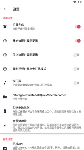 3、这款软件支持后置和前置摄像头,并且当设备存储不足时,支持“自动停止录制”。
