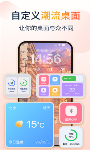 2、动态天气背景沉浸式强,20种特效随天气变化自动切换,晴天显示阳光光影,雨天呈现雨滴动画,搭配夜间模式智能调节亮度,兼顾信息获取与视觉体验。