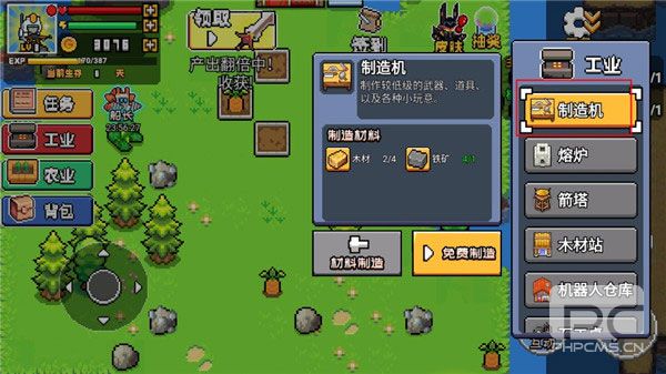 7、点击工业,然后点击制作机,可以免费制作饲料、铁矛、木箭、修理锤、木镐等用品;
