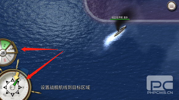 4、游戏内我们要通过左侧控制船只发动机运作功率,左下角仪表控制战舰航行的方向;