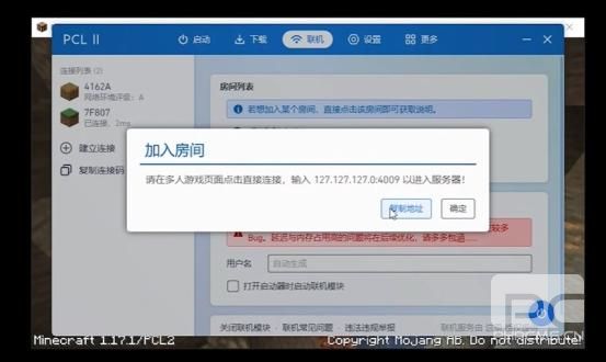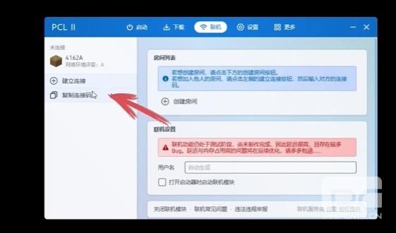 进入后,点击左侧的复制链接码,把这条神秘代码发送给你的朋友,让他在PCL中点击建立连接。