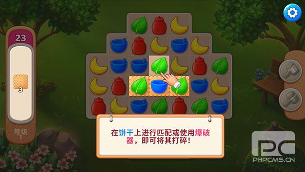 1、进入关卡之后,还是大家所熟悉的三消玩法,在饼干上进行匹配或使用爆破器,即可将其打碎。