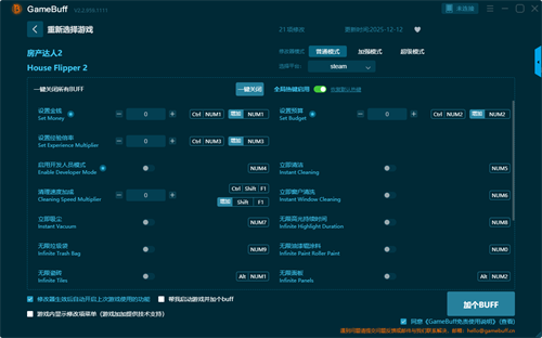 房产达人2修改器电脑版专为同名游戏《房产达人2》打造的修改器,是PC端提升装修翻修体验的高效辅助工具,以多维度自定义功能,让玩家从资源与效率束缚中解放,专注创意设计,它支持金钱/预算倍率调节、经验倍数、无限高亮与即时清洁等核心项,一键解锁无限材料、任意放置物品、开发模式等能力,大幅缩短清洁与施工耗时,操作直观,按功能分类呈现,自动兼容版本并提示有效性,玩家可按需调节游戏速度,轻松掌控翻新节奏,快速积累资金打造理想房产,是进阶玩家与创意爱好者的首选辅助。
