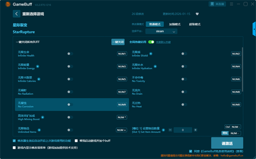 星际裂变修改器风灵月影版是专为科幻生存建造游戏《星际裂变(StarRupture)》打造的专属辅助工具,精准适配游戏抢先体验版本,覆盖角色、资源、世界三大核心维度的深度定制。它支持一键开启无限生命、护盾、能量、水分、卡路里等生存属性,彻底摆脱外星恶劣环境的生存焦虑;还能解锁无限物品、经验倍率、传送飞行、重力调节、清除毒素辐射等二十余项实用功能,让玩家跳过枯燥刷资源、反复死亡的流程,自由探索星球、搭建自动化基地、挑战外星生物,兼顾新手开荒减负与老玩家创意玩法,是提升太空生存体验的高效辅助利器。