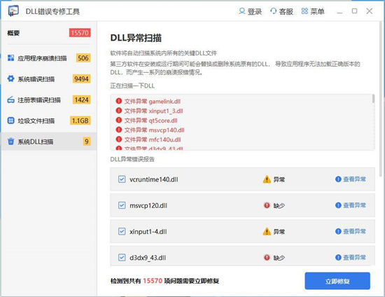 DLL修复工具免费版这是一款帮助用户更好的进行dllk文件修复功能使用,其强大的dll文件修复功能,是一款十分好用的dll修复工具。DLL修复工具免费版实用的软件平台,可修复系统丢失损坏的DLL文件,喜欢的朋友们不要错过了。