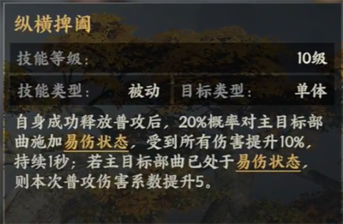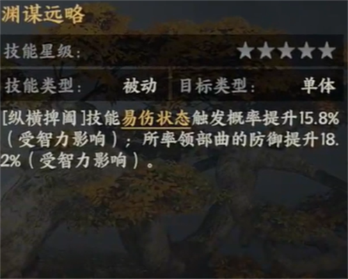 纵横捭阖属于它的被动技能,单体对抗时可以作为优先的技能进行使用。当自身释放出普攻后,拥有20%的概率可以直接对目标部曲释迦易伤状态,如果敌方已经处于易伤的状态,本次释放普攻后将会把伤害的系数提升至5,从而增加更多的额外伤害。定谋贵决也是他被动技能的核心部分,技能等级达到10级时释放普攻后,能够拥有50%的概率提升部曲防御能力,并且以三秒钟作为持续时间,等级越高时,普攻的伤害就会随之增强。