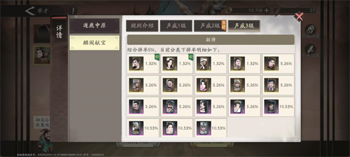 日常军务:完成声威任务提升等级,等级越高抽卡获取高星武将概率越高;
