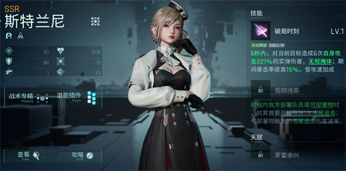 斯特兰尼在游戏当中,可以对当前目标造成一次基于自身攻击倍率为221%的真实伤害,同时无视掩体,期间暴击率还会提升15%,是一个攻速流的输出型角色。