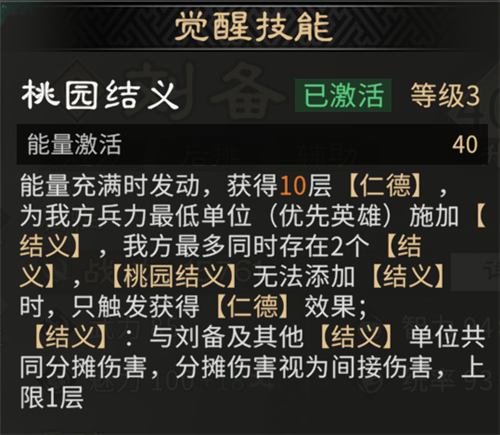 刘备的觉醒技能可以让刘备快速获得大量【仁德】层数,并且为我方兵力最低的单位施加【结义】为其分摊伤害。非常好的弥补了刘备【仁德】层数获取慢的问题,还给刘备提供很强的保人能力。