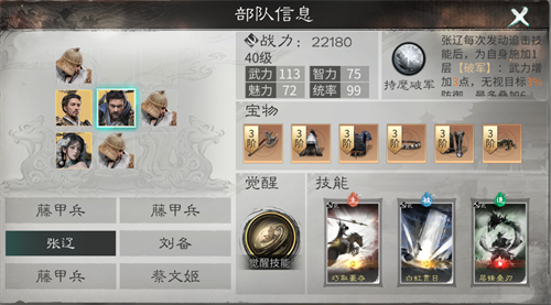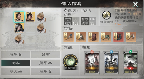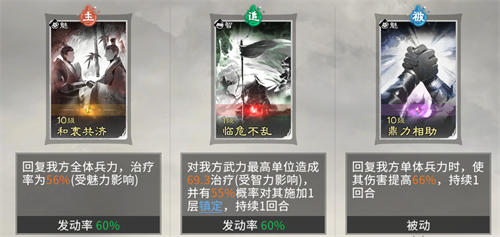刘备在技能方面都差不多,主动技能依旧携带和衷共济;被动技能可以使用鼎力相助让主C打出更高的输出;追击技能携带临危不乱,给武力最高的单位治疗+镇定,可以让张辽/吕布免疫控制更好的打输出。