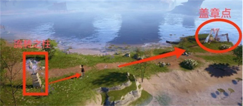 传送至星空钓场锚点后,向后转沿小路前行,盖章点位于水边的尽头处。