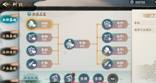 那接下来自然就是科技升级的关键技巧,很多玩家都会走弯路。建议打开培养界面的科技板块,一开始千万不要猛砸兵种基础科技,正确的做法是先解锁后勤基础,然后把里面的核心技能点点满。这个操作看上去有一些绕路,但实际上就是节省时间节省钱的关键。兵种基础的低等级科技在升级时,浪费的时间相对比较短,所以在点满之后就能免费升级,不需要花一分元宝,也无需去使用珍贵的沙漏道具。相当于通过白嫖的方法就可以获得很多的属性,按照这一个思路,就可以保证资源的充足,还能迅速的提升战斗力。